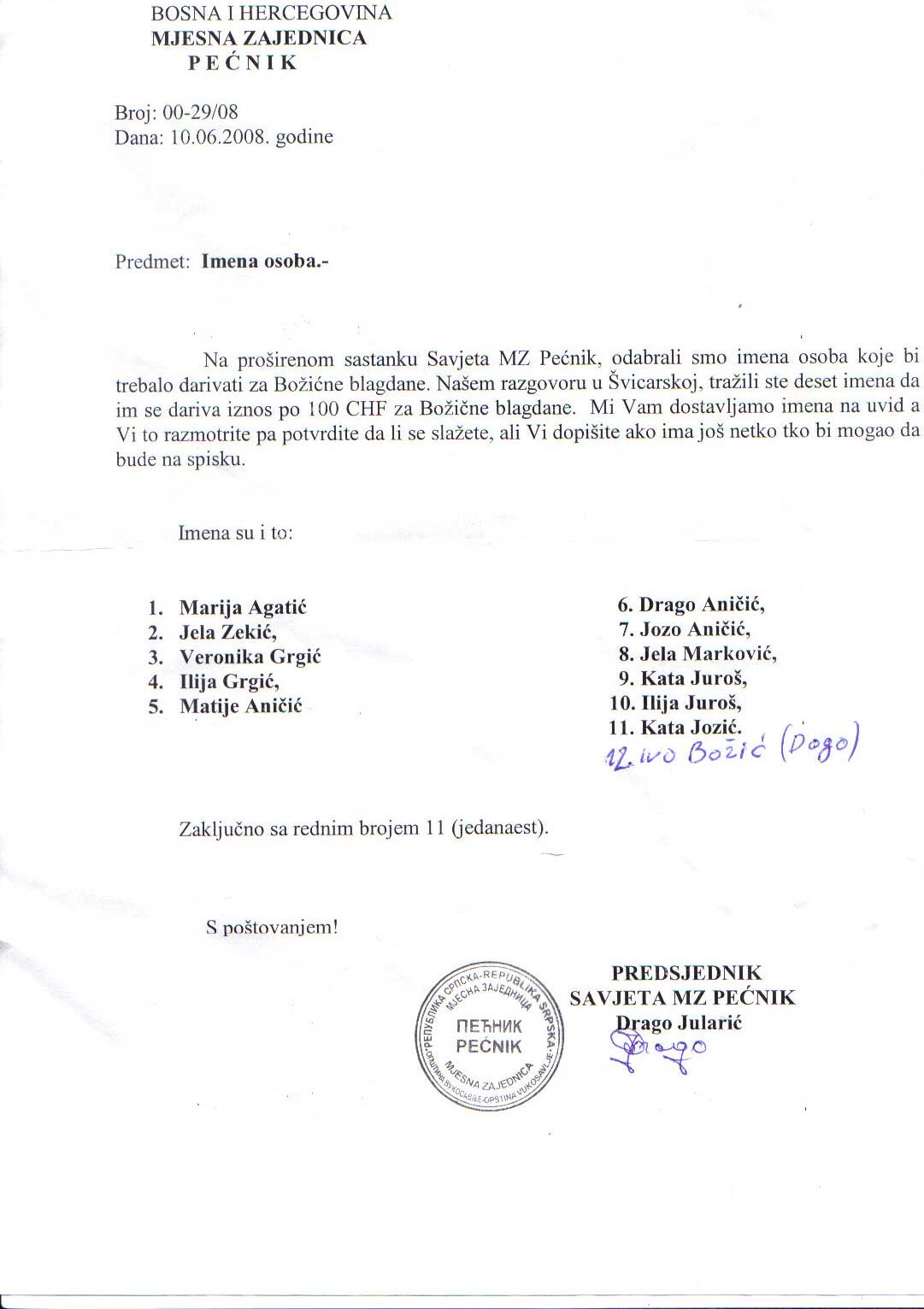 Na proširenom sastanku Savjeta MZ Pećnik, odabrali smo imena osoba koje bi trebalo darivati za Božićne blagdane. Našem razgovoru u Švicarskoj, tražili ste deset imena da im se dariva iznos po 100 CHF za Božićne blagdane...