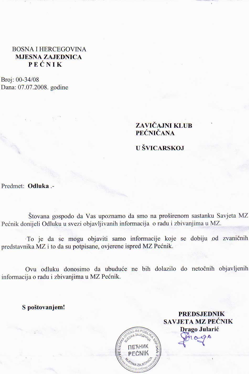 Štovana gospodo da Vas upoznamo da smo na proširenom sastanku savjeta MZ Pećnik donijeli Odluku u svezi objavljivanja informacija o radu i zbivanjima u MZ. To je da se mogu objaviti samo informacije koje se dobiju od zvaničnih predstavnika MZ, i to da su potpisane, ovjerene od strane MZ Pećnik...