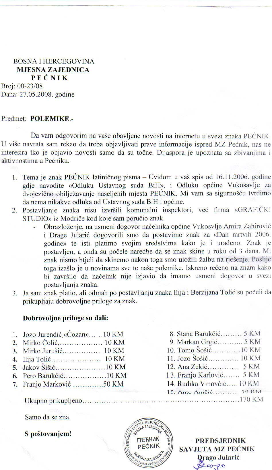 Da Vam odgovorim na vaše objavljene novosti na internetu u svezi znaka PEĆNIK. U više navrata sam rekao da treba objavljivati prave informacije ispred MZ Pećnik, nas ne interesira tko je objavio novosti samo da su točne. Dijaspora je upoznata sa zbivanjima i aktivnostima u Pećniku...
