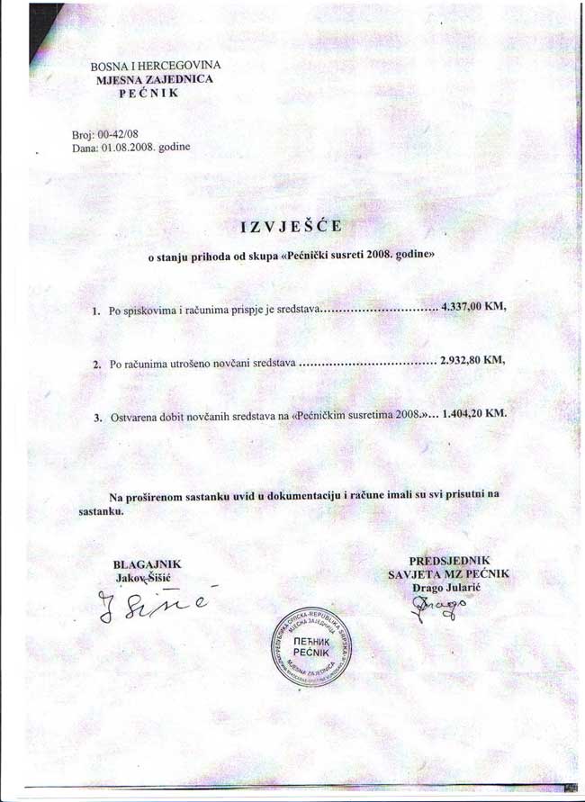 IZVJEŠĆE O STANJU PRIHODA OD SKUPA"PEĆNIČKI SUSRETI 2008. GODINE"