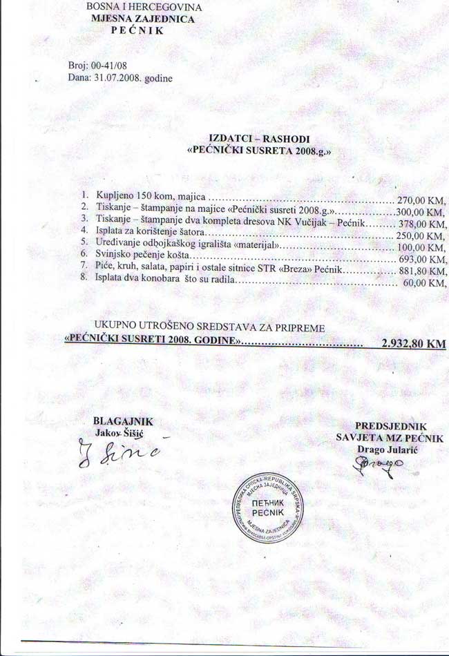IZDATCI - RASHODI "PEĆNIČKI SUSRETA 2008 GODINE"