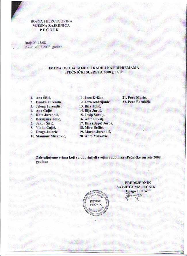 IMENA OSOBA KOJE SU RADILE NA PRIPREMAMA"PEĆNIČKIH SUSRETA 2008 GODINE"