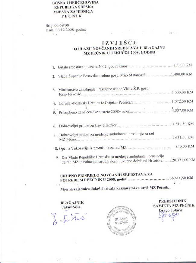 IZVJEŠĆE O ULASKU NOVČANIH SREDSTAVA U BLAGAJNU MZ PEĆNIK U TEKUĆOJ 2008. GODINI