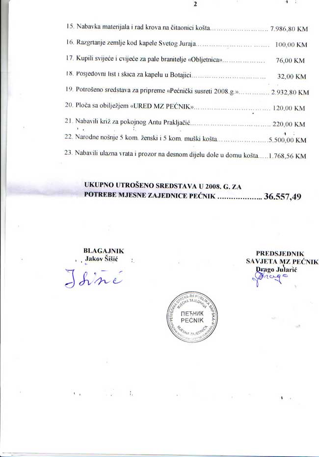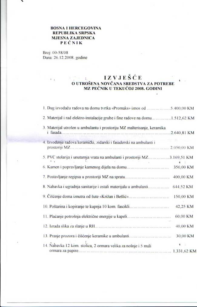 IZVJEŠĆE O UTROŠENIM NOVČANIM SREDSTVIMA ZA POTREBE MZ PEĆNIK U TEKUĆOJ 2008. GODINI