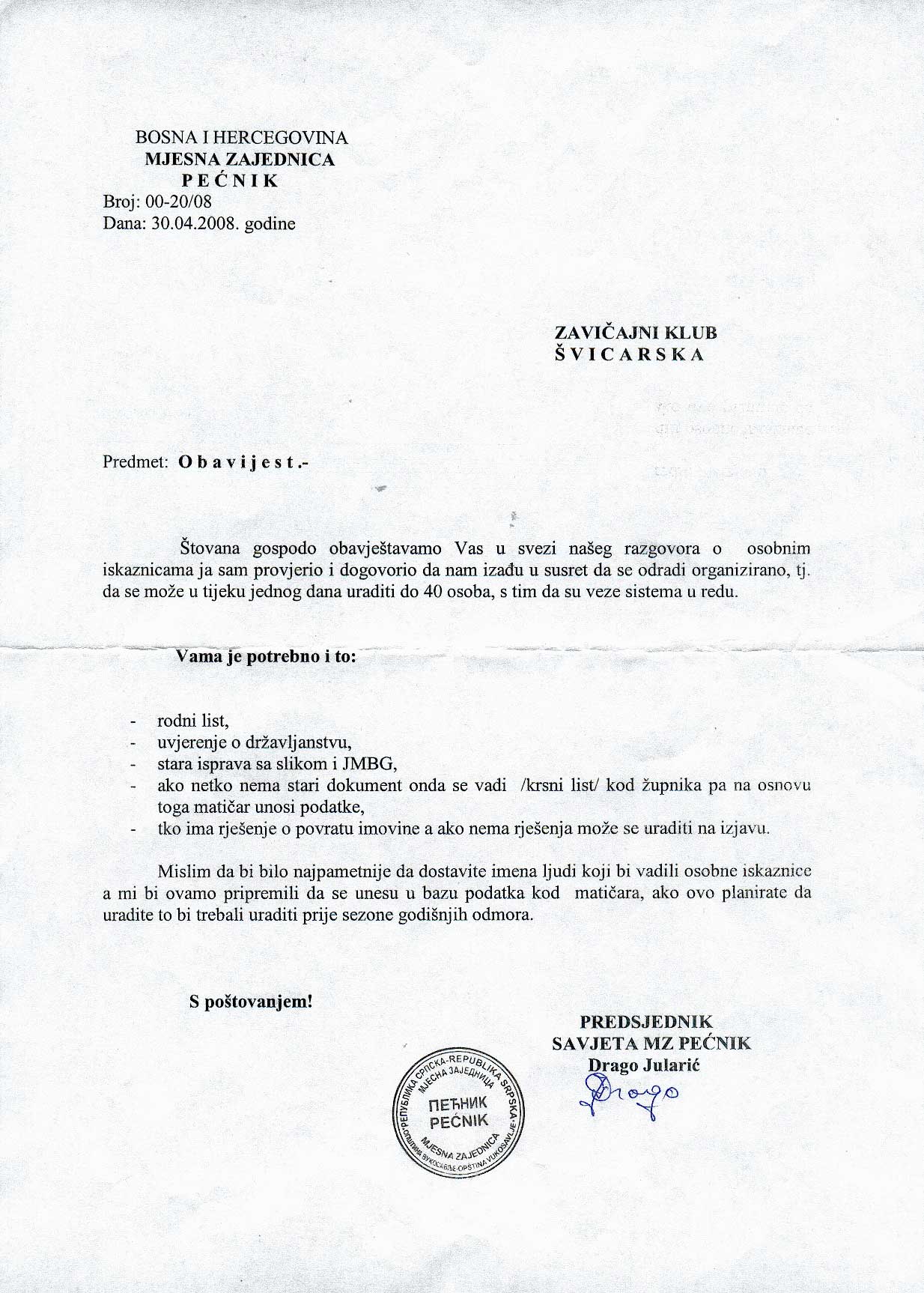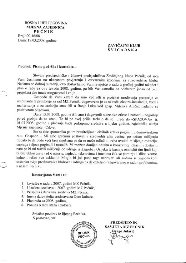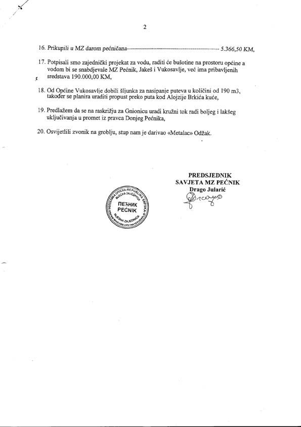 Ja Vas pozdravljam u ime Savjeta Mz "Pećnik" te u svoje osobno ime, uradili smo i to:...