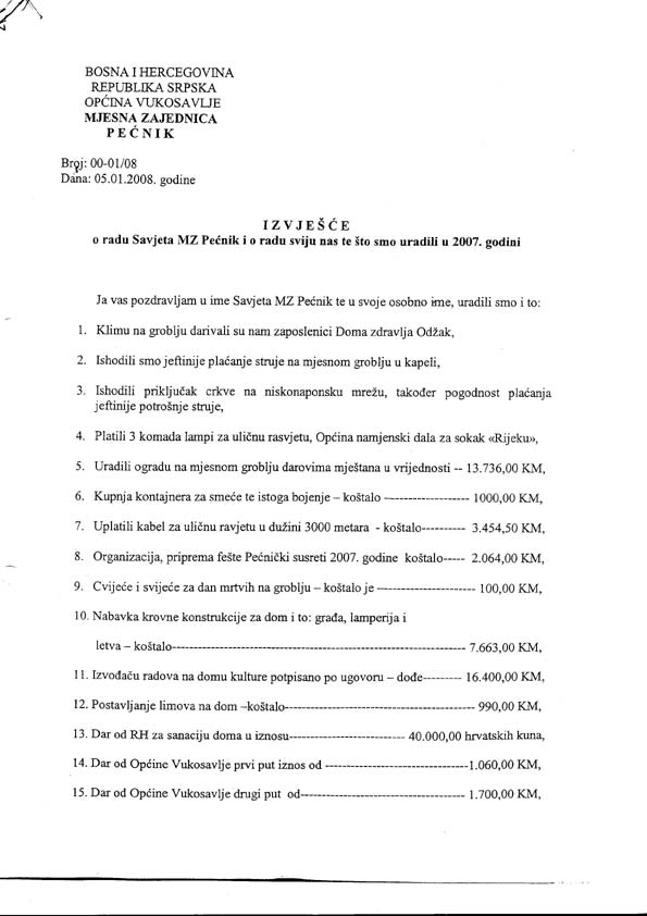 Izviješće o radu Savjeta MZ "Pećnik" u 2007 godini