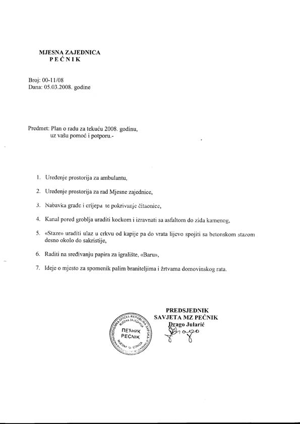 Predmet: Plan o radu Mjesne zajednice Pećnik za tekuću 2008 godinu, uz vašu pomoć i potporu..