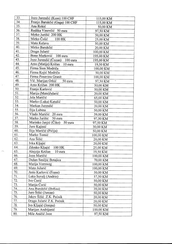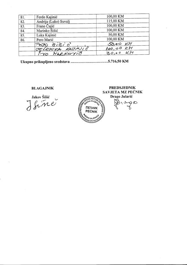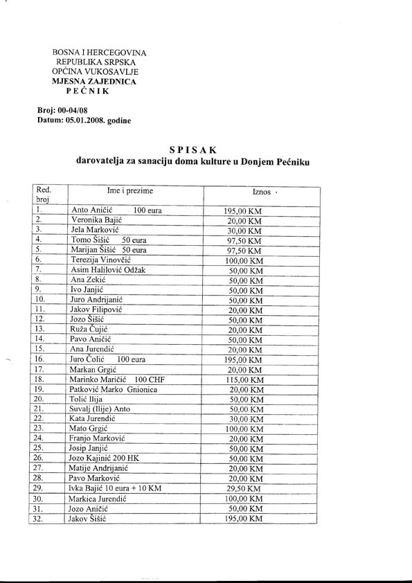 Predmet: Spisak darovatelja za sanaciju doma kulture u Donjem Pećniku