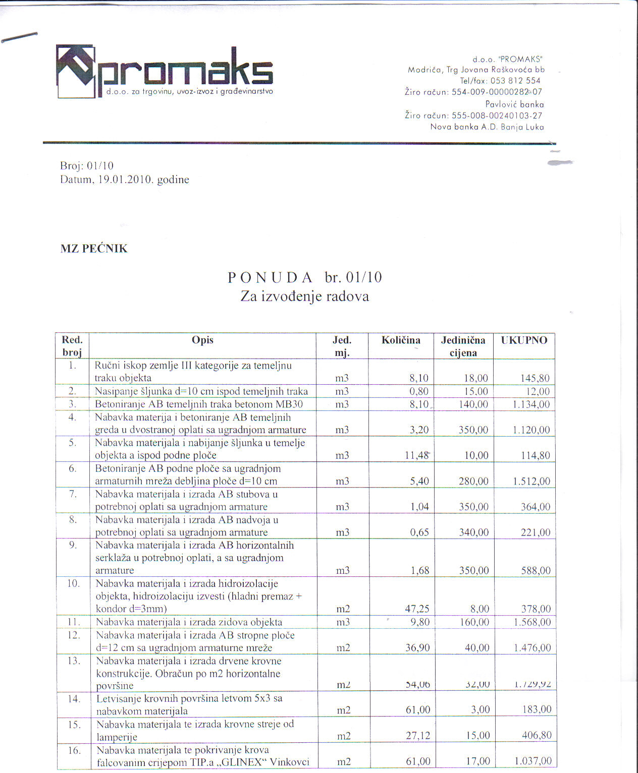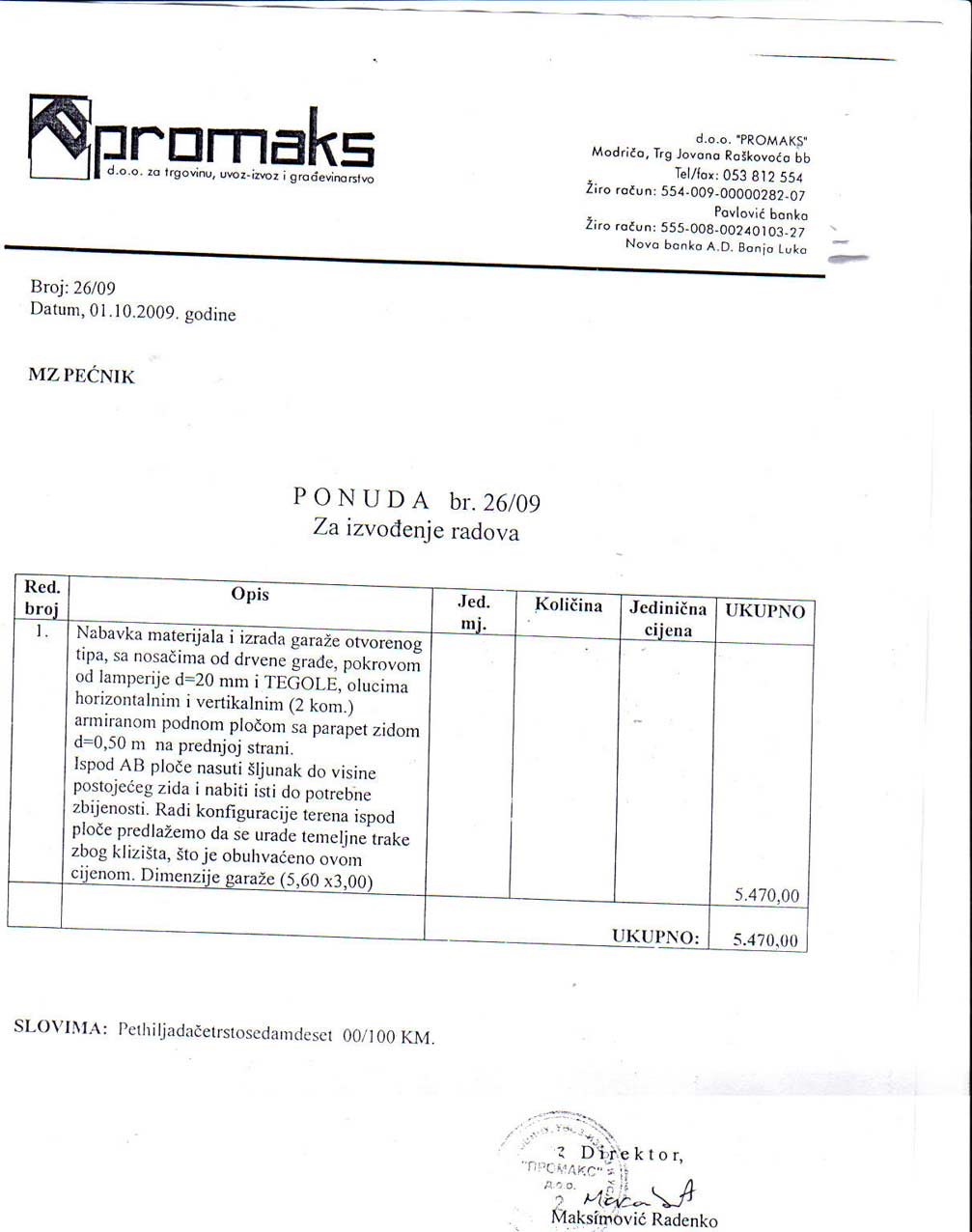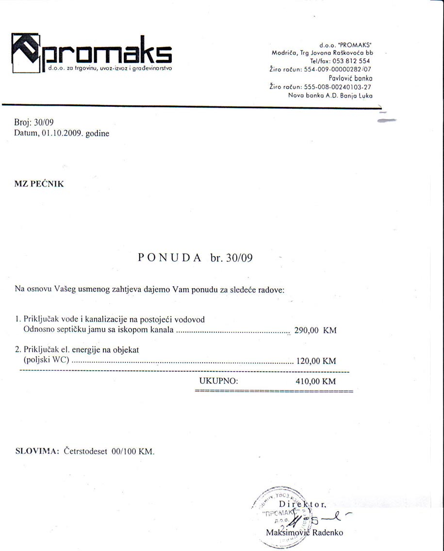 Naši vrijedni prijatelji iz MZ Pećnik dostavili su nam ponude i ugovor o izvođenju radova na izradi garaže, vanjskog WC-a, izradi potpornog zida i priključka vode, kanalizacije i el. energije.